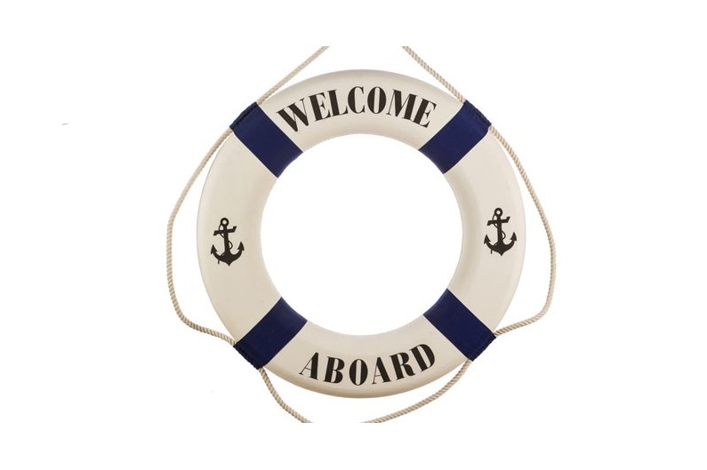 Garde de vie de sauvetage décorative "Bienvenue a Bord" - "Welcome on board" réversible. Réplique exacte d'une bouée de sauvetage idéale pour donner une touche marine. L'intérieur de la bouée est réalisé en porexpan, recouverte d'une toile en coton et entourée d'une corde utilisée comme point d'accroche.