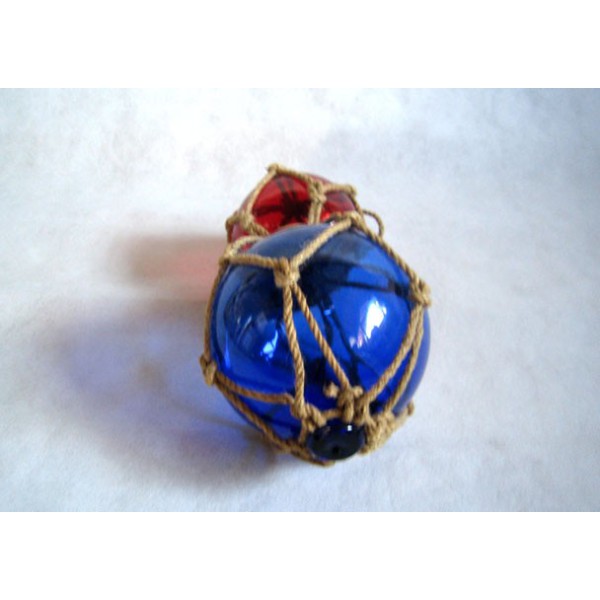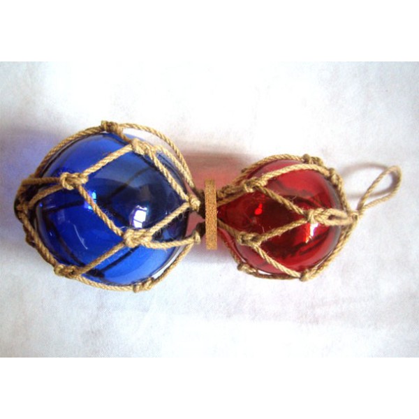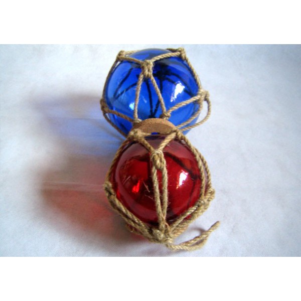 Deux bouées de pêche rouge et bleu. La bouée de pêche est un ancien flotteur utilisé jusque dans les années 50, constitué d'une boule en verre entouré d'un cordage tressé. Ces flotteurs étaient fixés sur les filets de pêche pour qu'ils restent à la surface, tout en dérivant emportés par le courant.