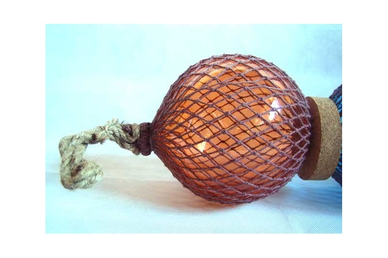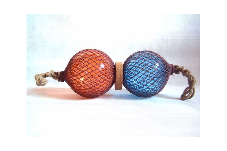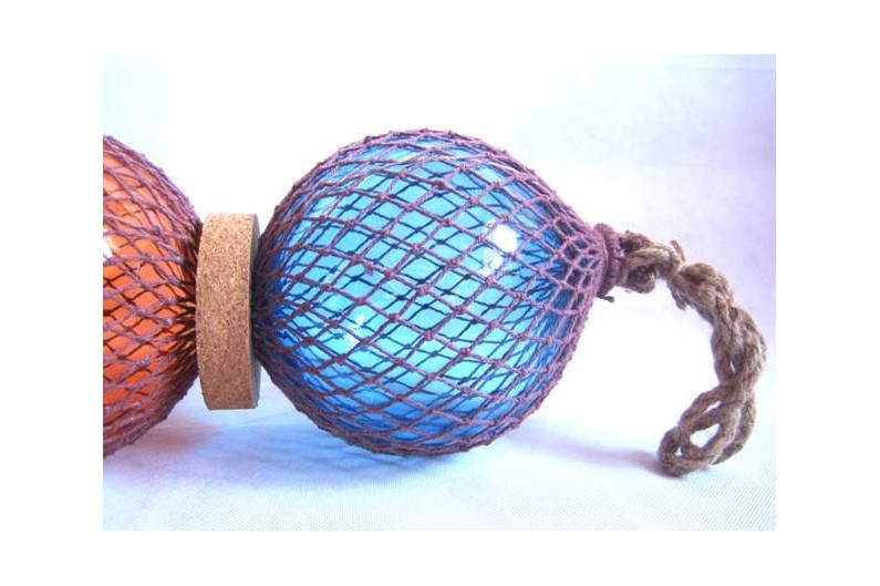 Bouée de casier bleue et orange. La bouée de casier est un ancien flotteur utilisé jusque dans les années 50, constitué d'une bouée en verre entouré d'un cordage tressé. Ces flotteurs étaient fixés sur les filets de pêche pour qu'ils restent à la surface, tout en dérivant emportés par le courant.