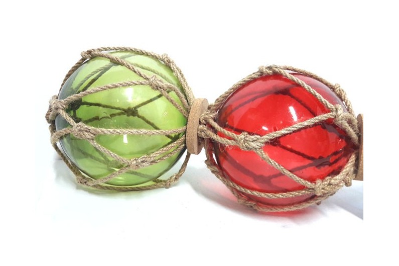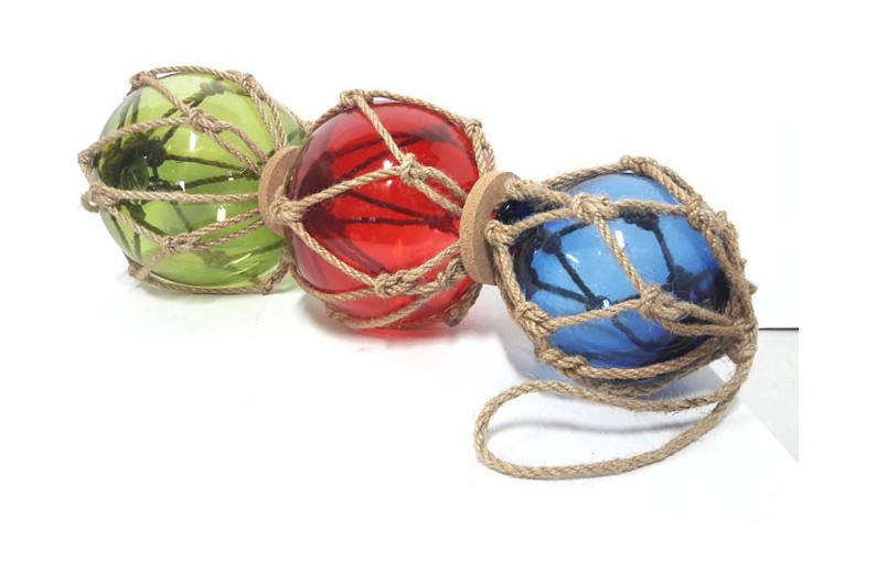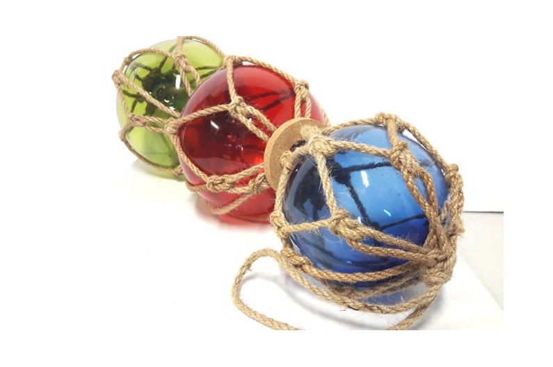 Trois bouées de casier bleu, rouge et verte. La bouée de casier est un ancien flotteur utilisé jusque dans les années 50, constitué d'une bouée en verre entouré d'un cordage tressé. Ces flotteurs étaient fixés sur les filets de pêche pour qu'ils restent à la surface, tout en dérivant emportés par le courant.