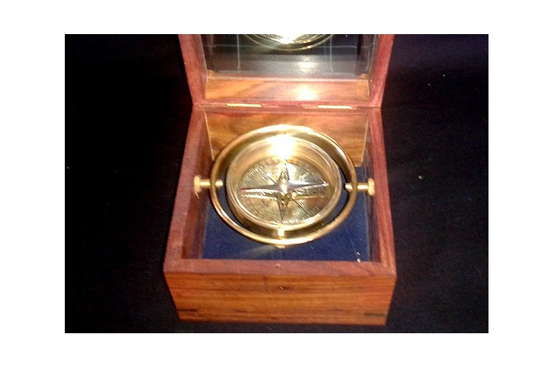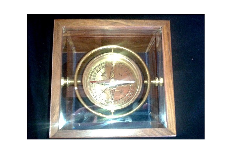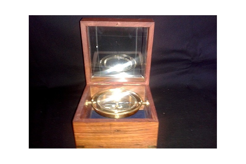Inspiré d'un compas de marine à rose sèche du XIXème S. le cadran est en laiton et la boîte en bois de rose.