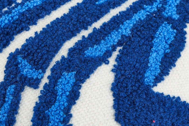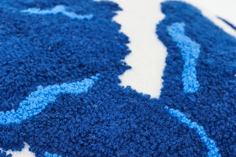 Coussin en coton et laine de haute qualité, avec des éléments nautiques en blanc et bleu, idéal pour votre maison élégante.