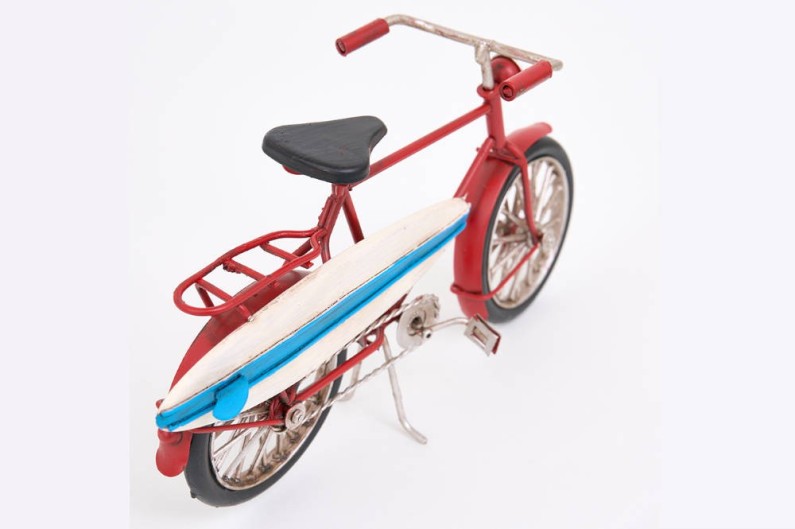Figurine d'un beau vélo des années 70 avec une planche de surf, prêt à aller à la plage.