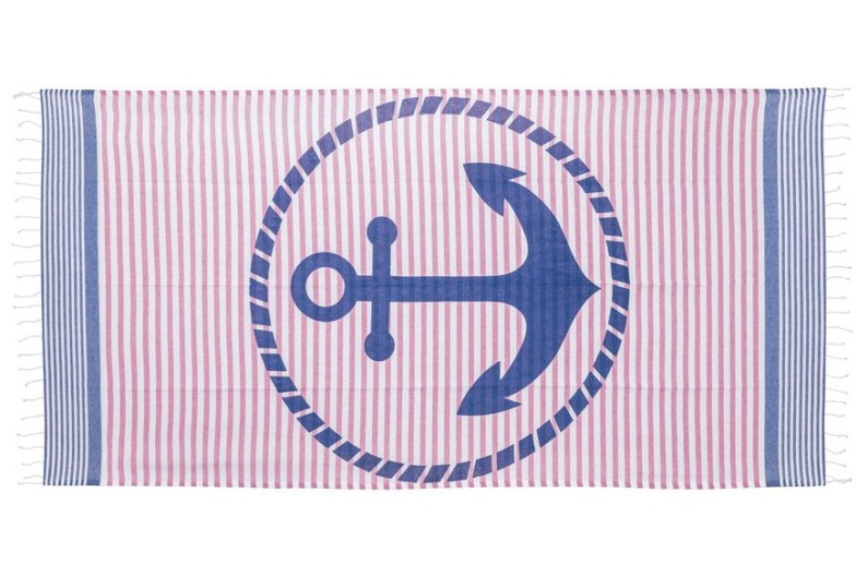Serviette de plage imprimé d'un ancre. D'un côté vous avez l'imprimé rayé qui fait office de paréo, et d'autre part, la serviette absorbante vous séchera après la baignade.