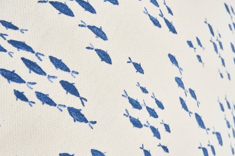 Coussin de haute qualité, 100% coton et laine, avec un magnifique imprimé poisson bleu.