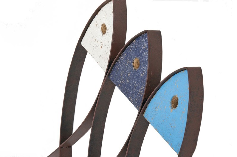 Décoration murale avec des formes de poissons, fabriquée à la main en acier et bois.