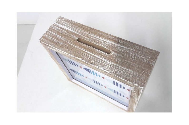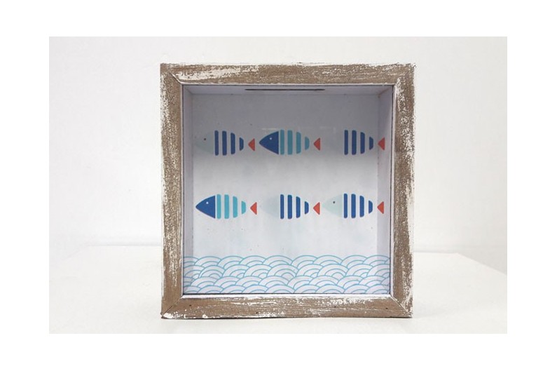 Précieuse tirelire faite à la main, en bois et verre, avec  dessins de baleines.