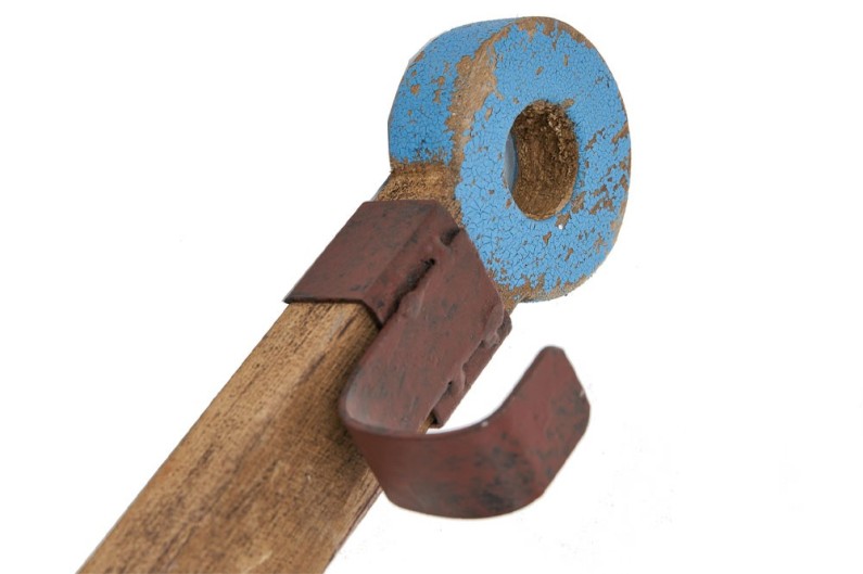 Porte-manteau avec base en bois et cintre en acier, en forme d'ancre.