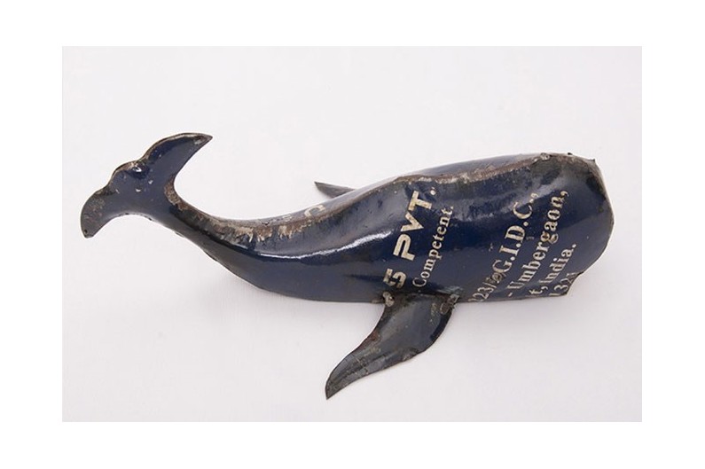 Figurine baleine en métal, réalisé avec de la tôle obtenue à partir de bidons métalliques recyclés.