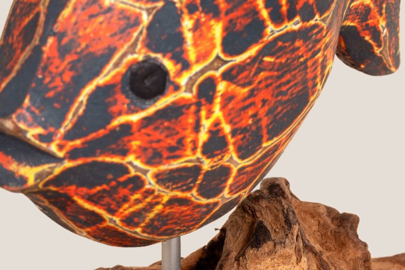 Petit poisson rouge et marron en bois d'albasia avec un pied rustique. Fabriqué à la main en Indonésie.