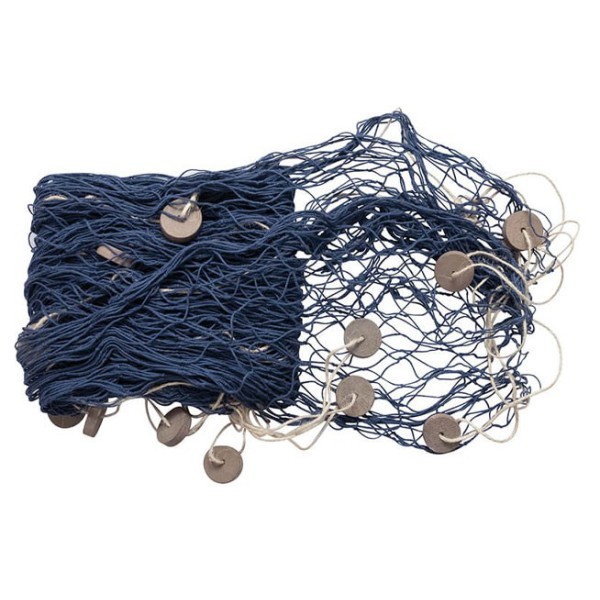 Filet de pêche en coton. Des flotteurs sont attachés à chaque extremité par une corde en chanvre. Objet de marine qui offrira un esprit déco bord de mer.