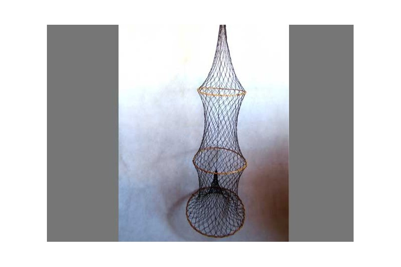 Nasse accordéon faite de filet de pêche et 5 anneaux en osier. Très utilisée dans les étangs, notamment pour la pêche des poissons-chats ainsi qu'en Méditerrannée pour les poissons de fond et les écrevisses. Bel objet décoratif pour créer une ambiance marine.