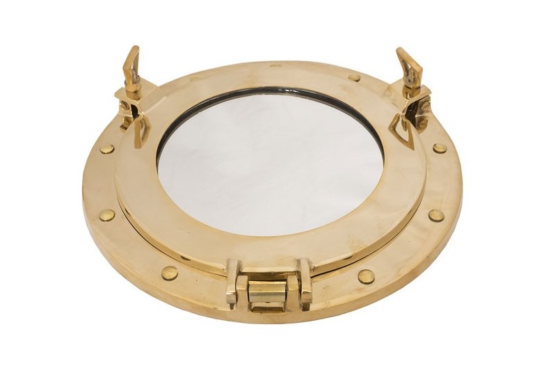 Miroir hublot nautique en laiton poli brillant avec anneaux et charnière.