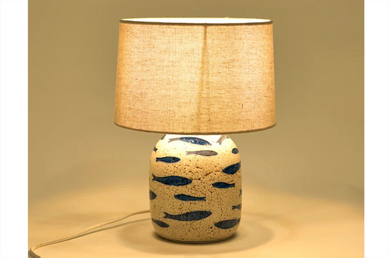 Lampe en terre cuite blanche, avec poissons bleus imprimés, lampe de table avec abat-jour en tissu translucide.