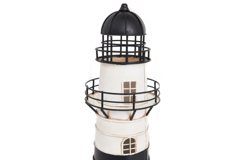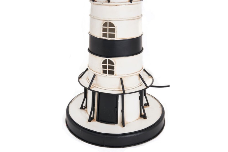 Phare en métal rayé noires et blanches avec lumière. La douille de phare (E14) se trouve sous le phare. Cette phare est conçue pour une utilisation en intérieur et fonctionne avec de l'électricité 220 V. La longueur du câble est de 1,5 m et il dispose d'un interrupteur pour allumer la lumière du phare.