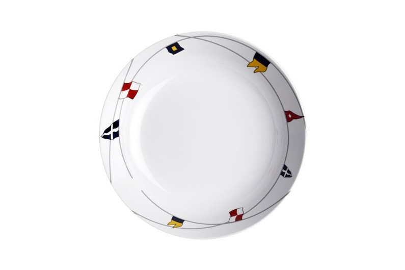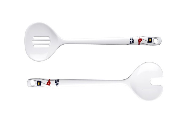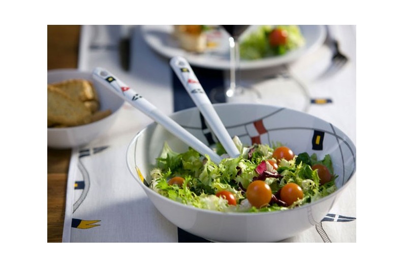 Saladier avec des éléments pour servir, beau design, de fond blanc et des drapeaux.