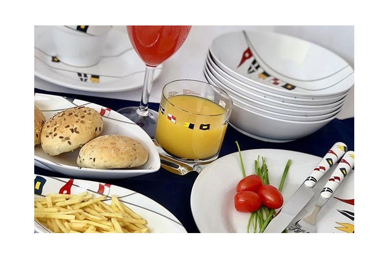 Set de 24 pièces, et compris: 6 assiettes plates, 6 assiettes creuse, 6 assiettes à dessert, 6 Mugs et des panier.