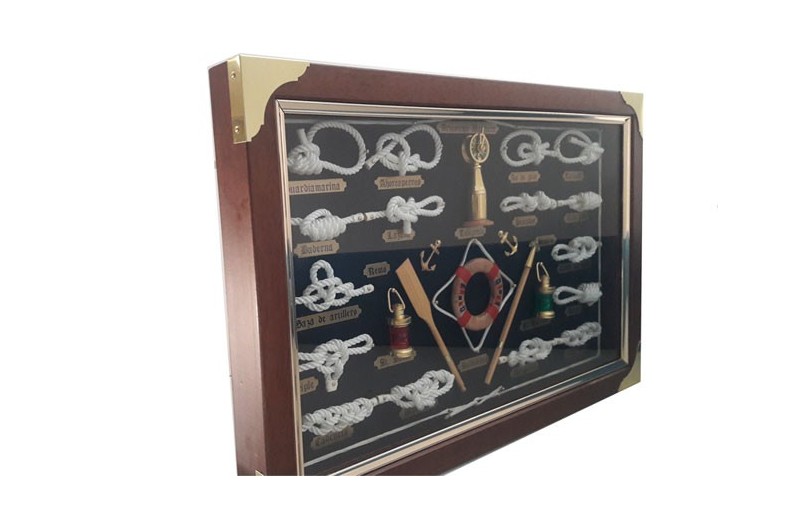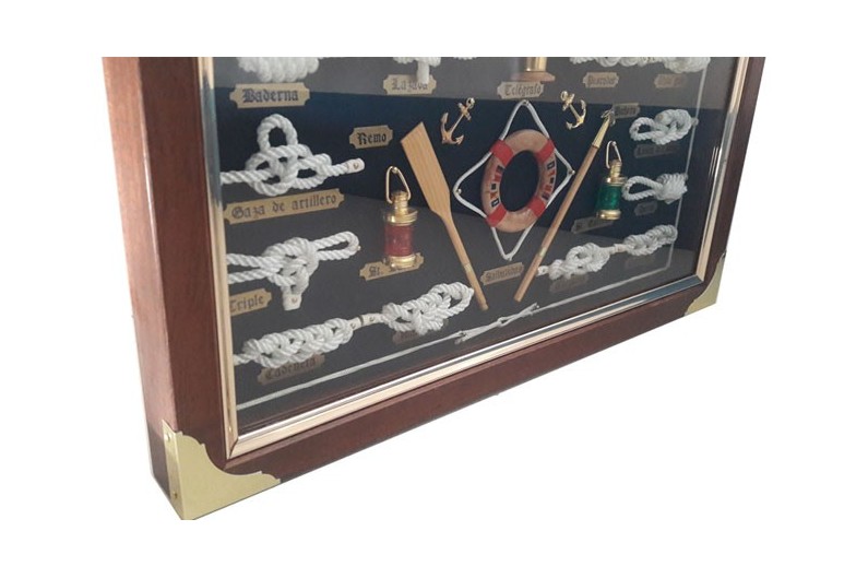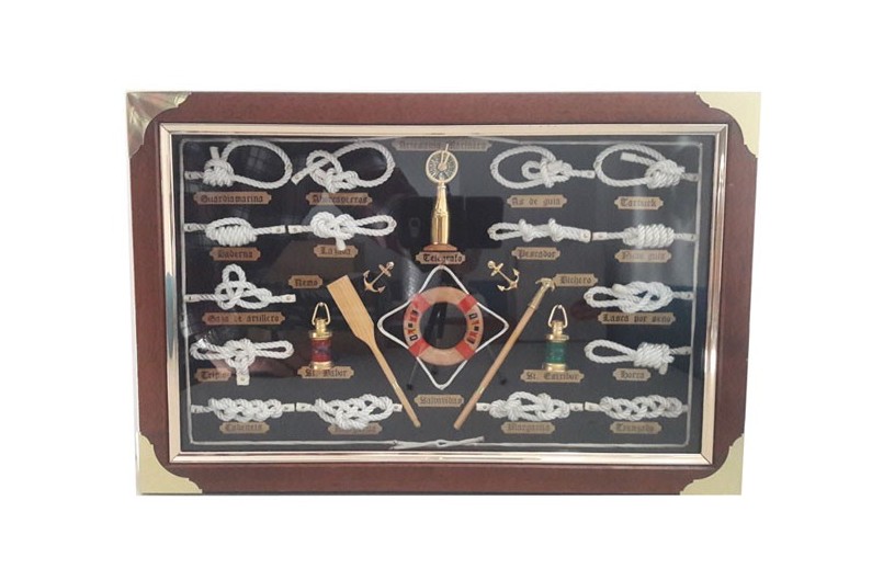 Belle tableau décorative des noeuds marins et des cordes, avec nombreux objets marins. Tableau en bois et protégé par un verre. La corde qui utliza est coton. Chaque nœud porte une plaque avec son nom gravé.