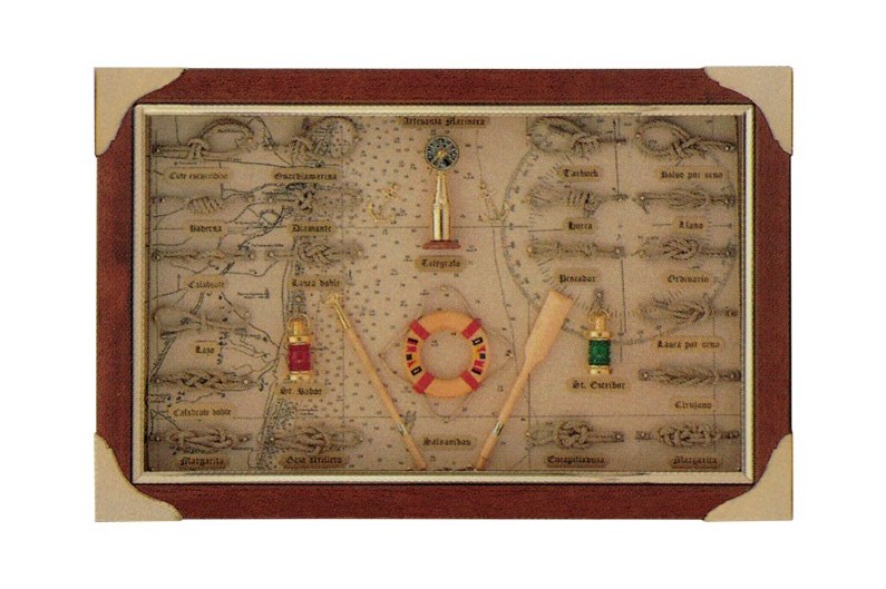 Belle tableau décorative des noeuds marins et des cordes, avec nombreux objets marins. Tableau en bois et protégé par un verre. La corde qui utliza est coton. Chaque nœud porte une plaque avec son nom gravé.