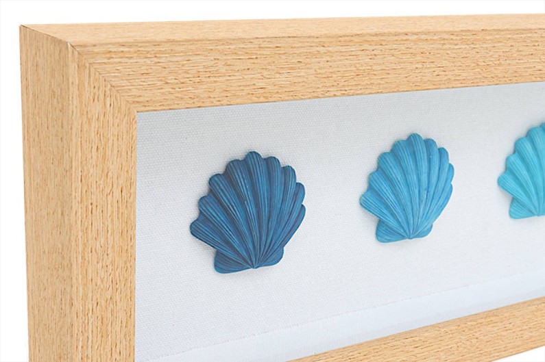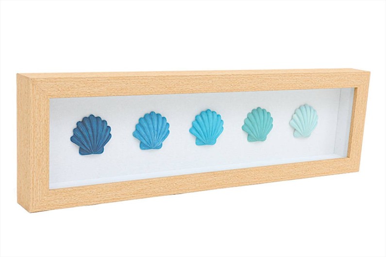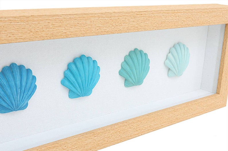 Tableau en bois marine décorative. Quelques beaux coquillages ressortent dans le tableau.