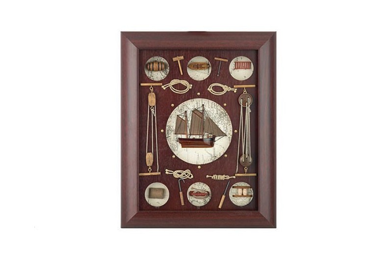 Belle tableau de noeuds marin. Son arrière-plan représente un diagramme nautique de temps, décoré avec un bateau en or et de nombreux objets de marine. Avec tableau avec des bords arrondis en bois massif. Tous les noeuds sont faits de corde de coton et porte une plaque avec son nom gravé