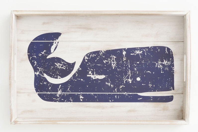 Plateau en bois avec une baleine imprimée. Peint pour ressembler à un objet usagé ou antique, idéal pour prendre le petit déjeuner au lit.