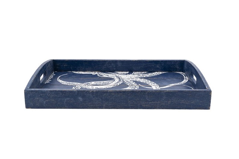 Plateau rectangulaire avec une poulpe de décoration, très léger et facile à transporter. Fait de bois.