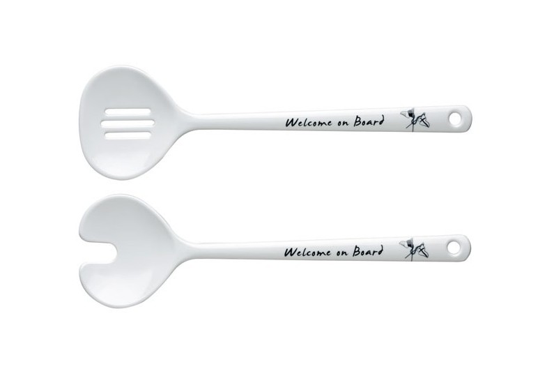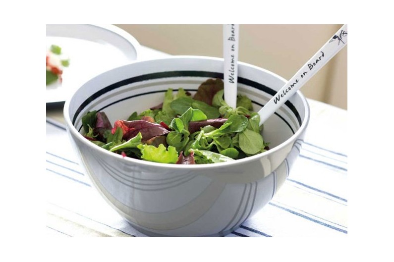 Saladier avec des éléments pour servir, beau design, fond écru.